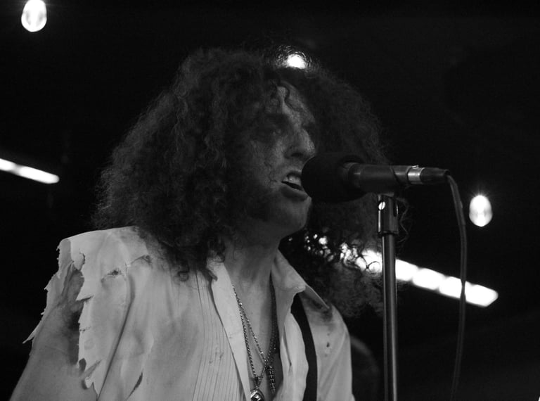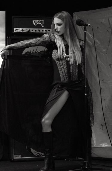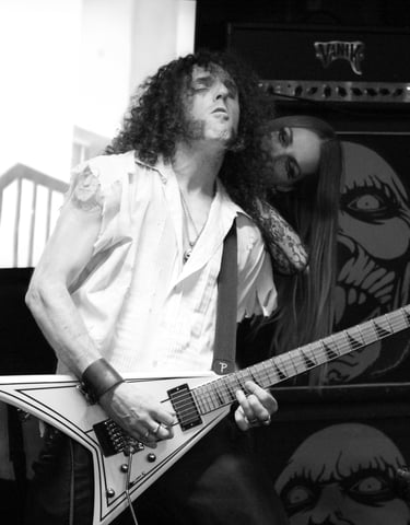 The set up included a 60” TV screen, 4 cabs, 2 heads, two silhouette screens and wash lighting. VANIK played his white Jackson Randy Rhodes Flying V, (popped out nicer than his regular, because of the color), and Carmilla was introduced to the set.